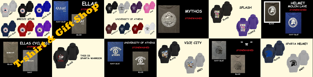 Διαθέτουμε τα καλύτερα πρωτότυπα σχέδια για ελληνικά μπλουζάκια, κεντητά με μεταξοτυπίες, τα περισσότερα από τα οποία δεν υπάρχουν σε κανένα άλλο κατάστημα. Έχουμε μια μεγάλη συλλογή από μπλουζάκια για τους Ολυμπιακούς Αγώνες της Αθήνας 2004, και αναπαραστάσεις της κλασικής ελληνικής τέχνης.