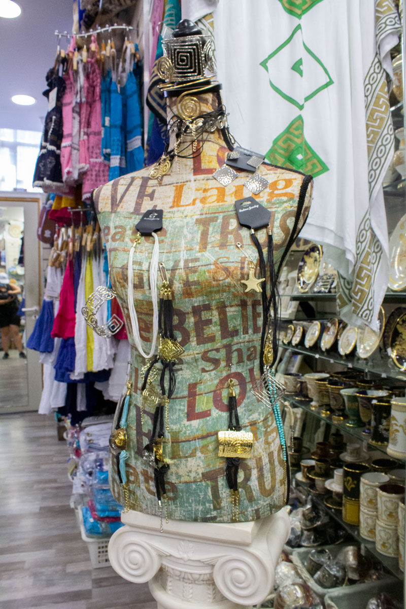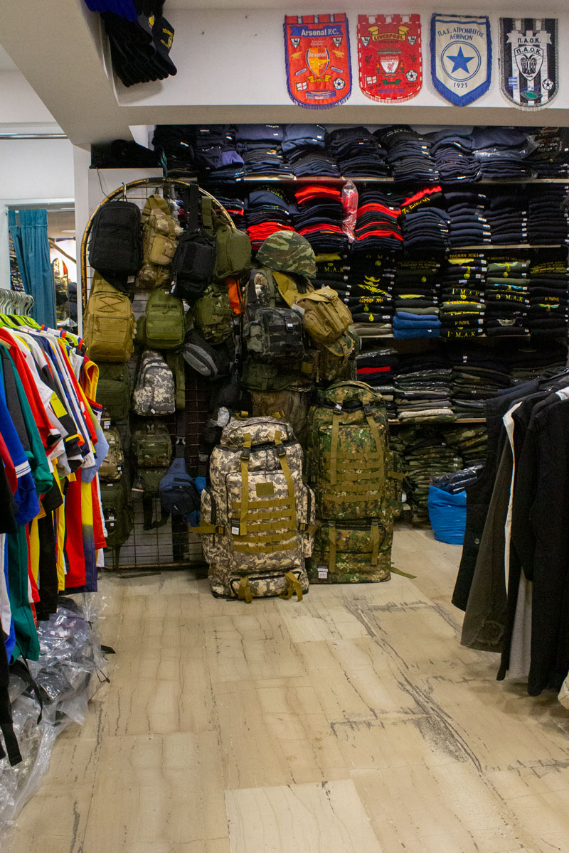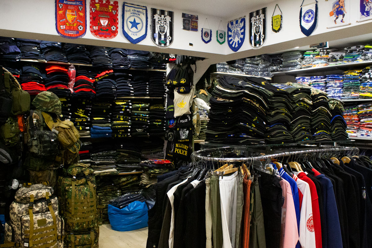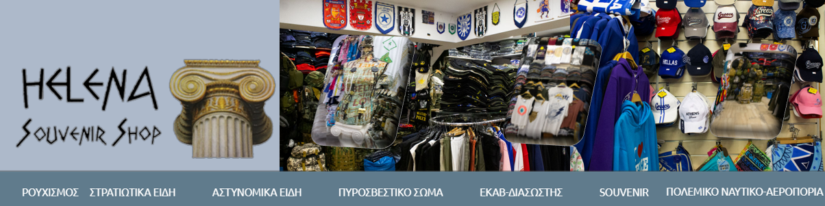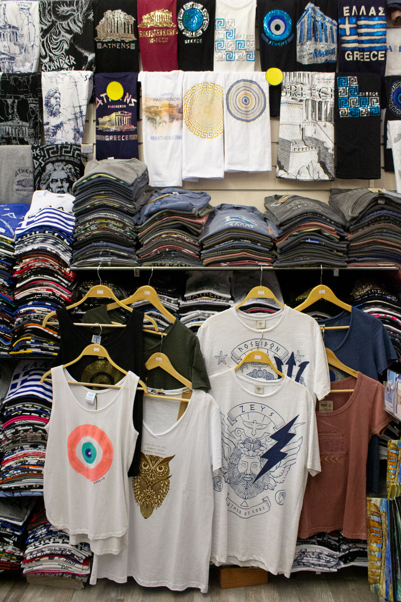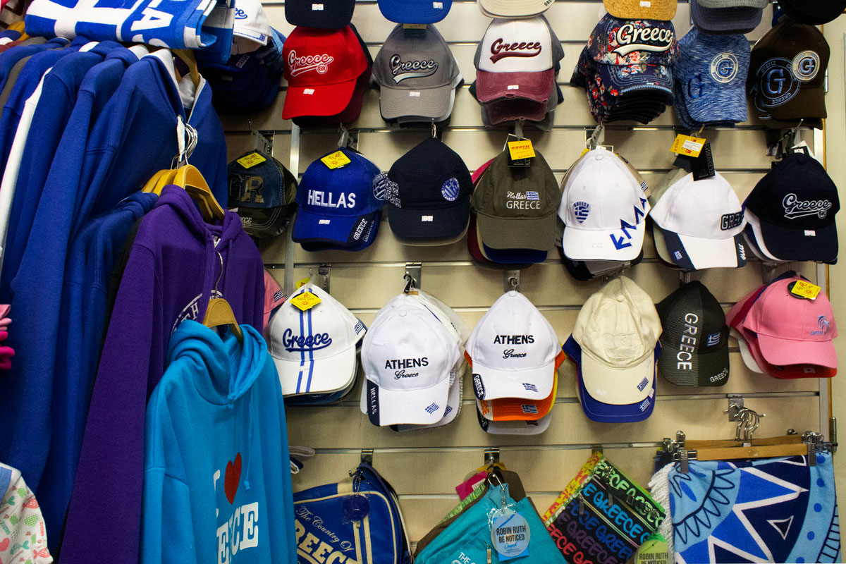 πανοπλίες, κράνη, αγάλματα και μια ποικιλία άλλων ελληνικών αναμνηστικών και ενδυμάτων.